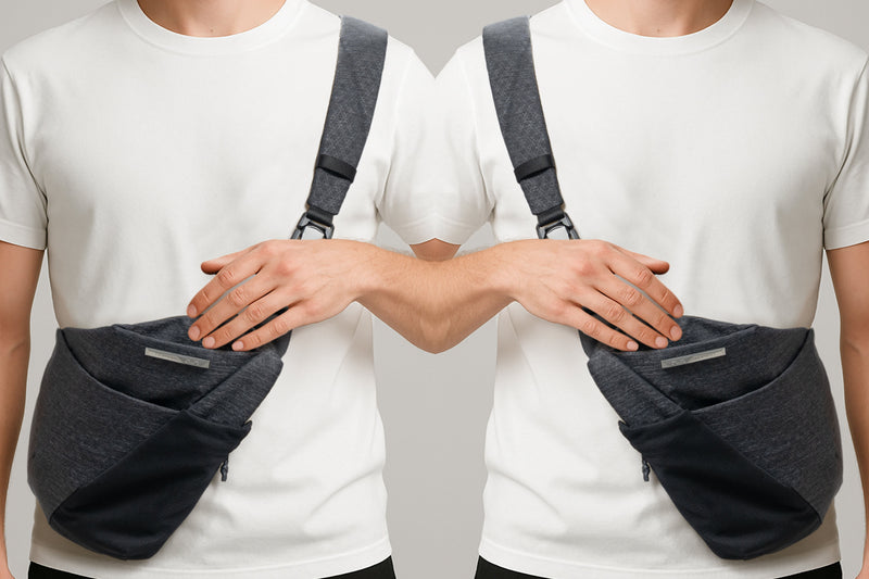 The FINO V is designed for asymmetrical wear. The "right-Handed" version is intended to be worn across the left shoulder, making it suitable for right-handed users such as fetching the cellphone with your right hand. Conversely, the "left-handed" version is worn across the right shoulder, catering to left-handed users.